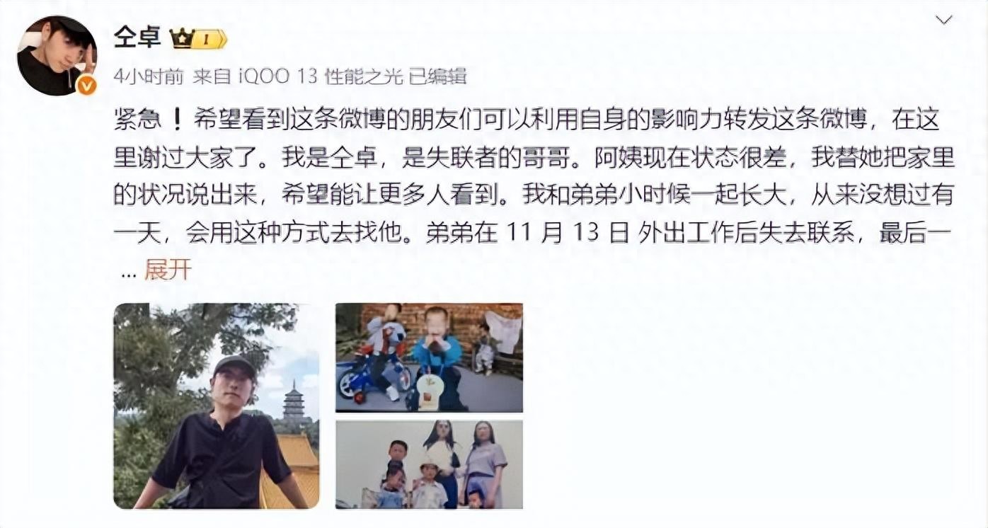 紧急!希望看到这条微博的朋友们可以利用自身的影响力转发这条微博,在这里谢过大家了。我是仝卓,是失联者的哥哥。阿姨现在状态很差,我替她把家里的状况说出来,希望能让更多人看到。我和弟弟小时候一起长大,从来没想过有一天,会用这种方式去找他。弟弟在11月13日外出工作后失去联系,最后一次出现的位置我们已经掌握。阿姨已经尽力了,也通过各种方式在找人。我们也愿意把完整资料私下提供给真正能够帮助到我们的机构和人士。