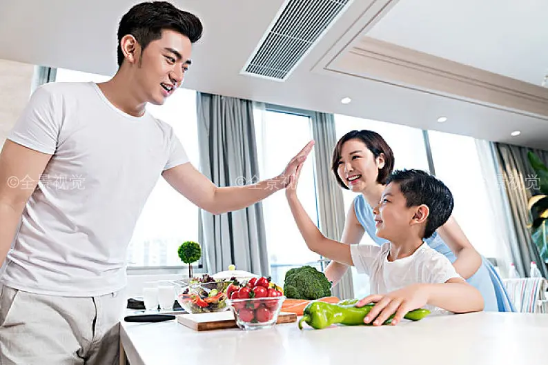 欢乐的一家三口在厨房做饭