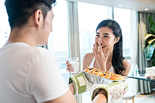 年轻情侣在厨房烤面包